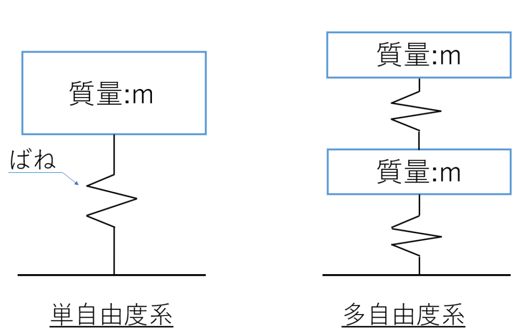 例えば、2自由度系であれば、剛性マトリクス・質量マトリクスはそれぞれ2×2のマトリクスとなります。